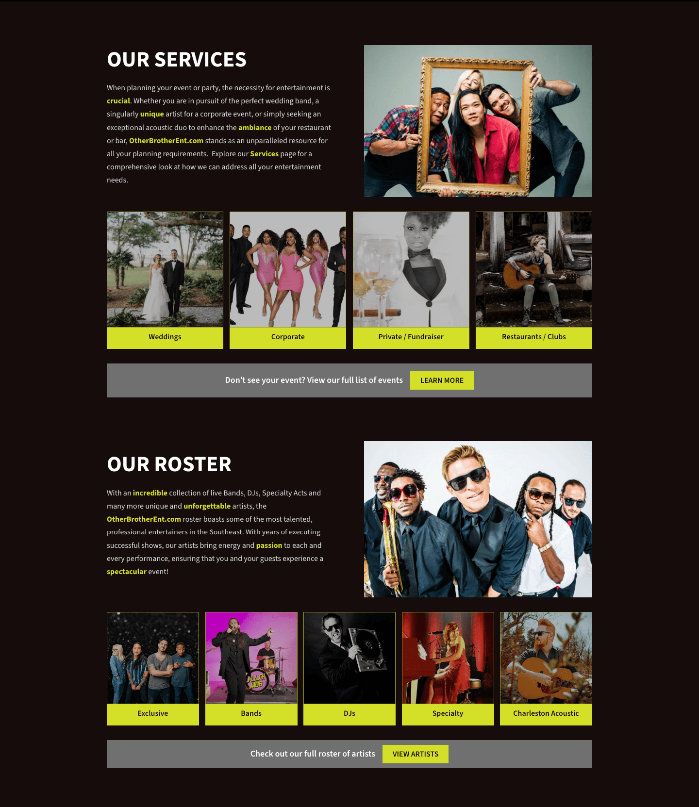 In celebration of their twentieth anniversary, Other Brother Entertainment wanted to level up their web presence and create custom graphics. First, we helped design a set of 20th-anniversary logo badges featured on truck wraps, t-shirts, beer cans, and much more! Next, we redesigned their website, building a new solution from the ground up. The goal was to give customers more information and media about the bands and DJs. This way, they could decide who to book while showcasing Other Brother’s diverse pool of talented musicians. The outcome is a stylish, informative website that is easy to navigate and worth celebrating!