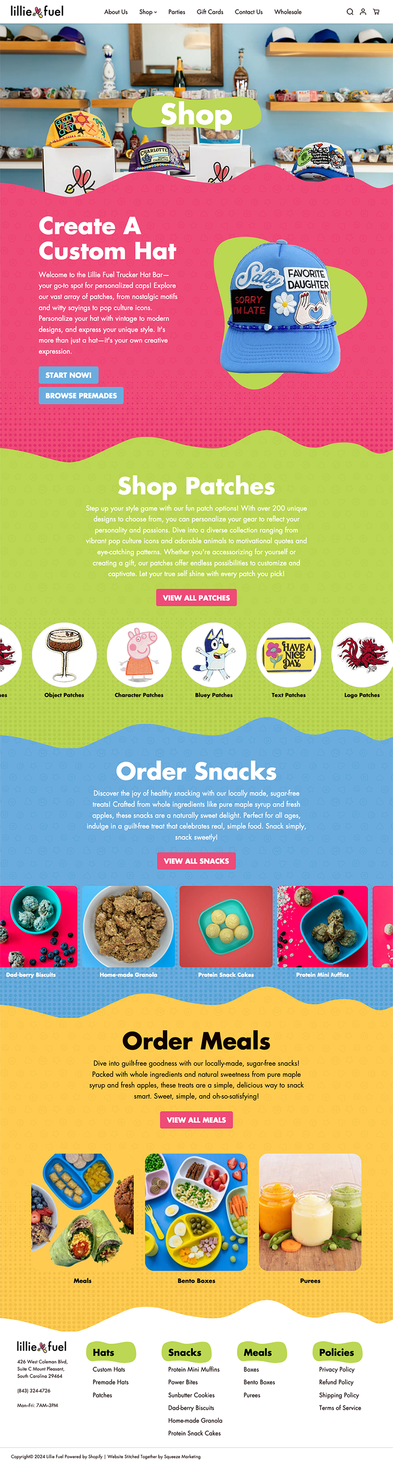 Lillie Fuel is a local business that creates custom trucker hats, sells snacks, and serves premade meals. They came to Squeeze to help redesign their e-commerce site to be more like their social media branding and provide a better understanding of what their business is about. By combining excellent photography and fun, vibrant visual designs, we worked together to create a truly unique website for local moms and their kids.